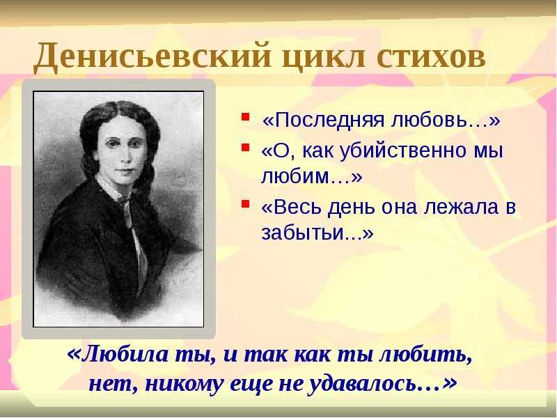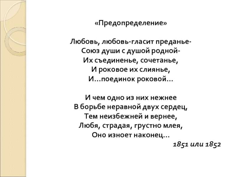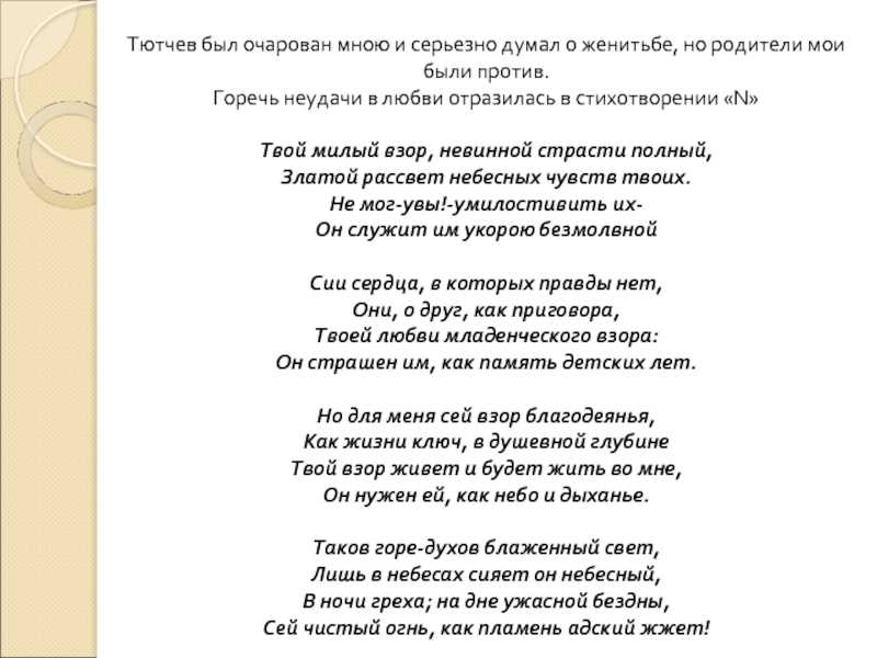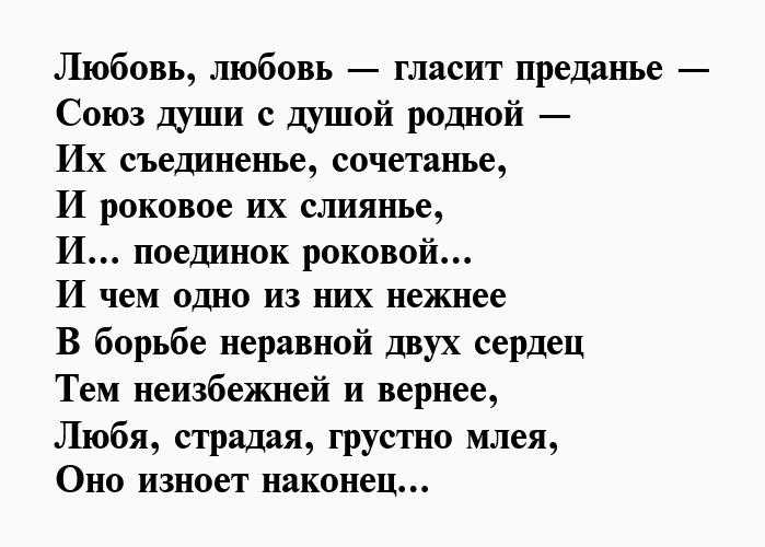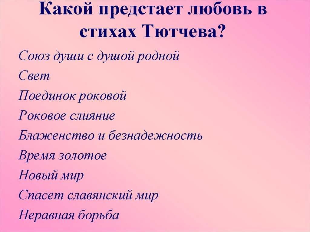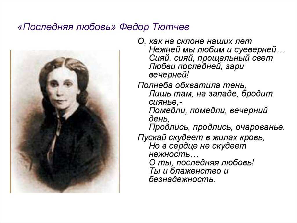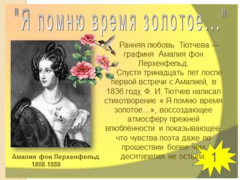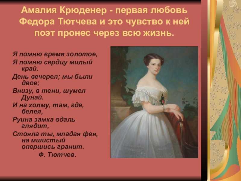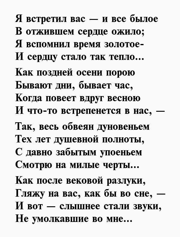 Стихи о любви Тютчев писал не только в молодые, но и в зрелые годы, черпая вдохновение из юношеских увлечений. Пример такого стихотворения – «Я встретил вас…». В нем отразилась история влюбленности поэта в Амалию Крюденер и их встреча после многолетней (выражаясь поэтическим языком – «вековой») разлуки. Он с упоением вспоминает «время золотое».
