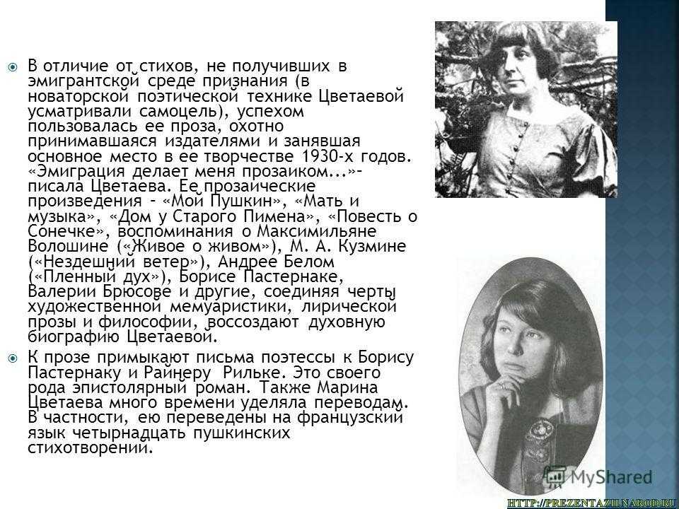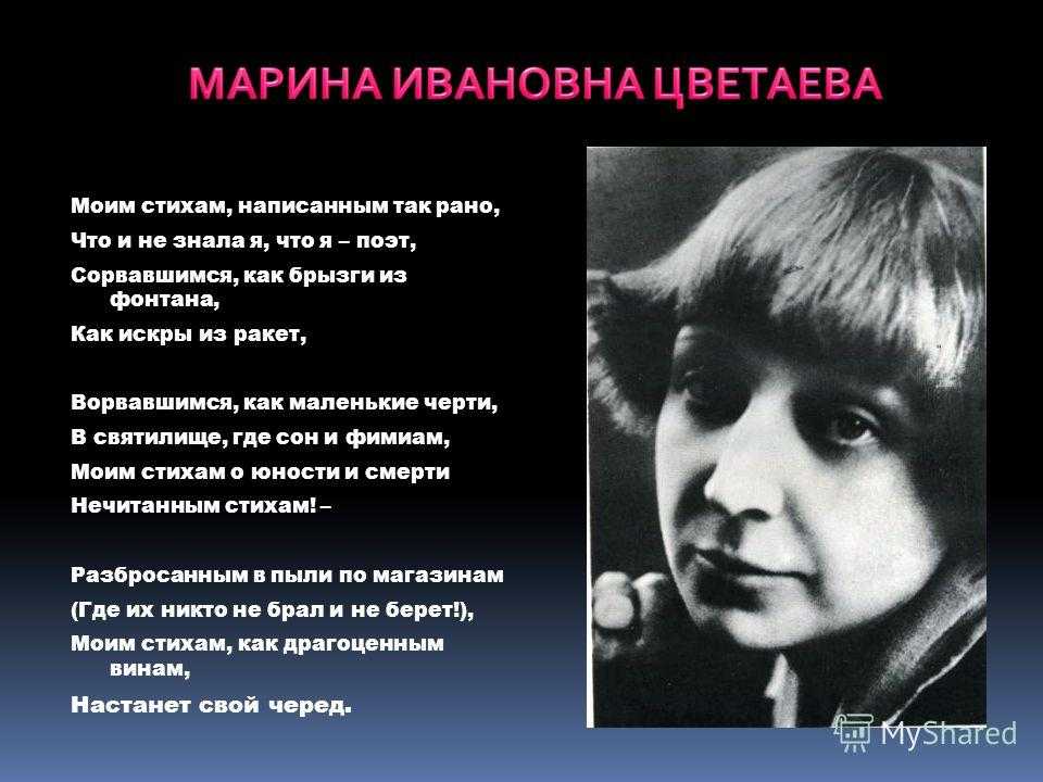 Марину Цветаеву считают одной из самых ярких поэтесс в русской литературе. Она привила читателям некую женственность, образность, романтичность, непредсказуемость. Ее творческие работы были наполнены любовью и светом.