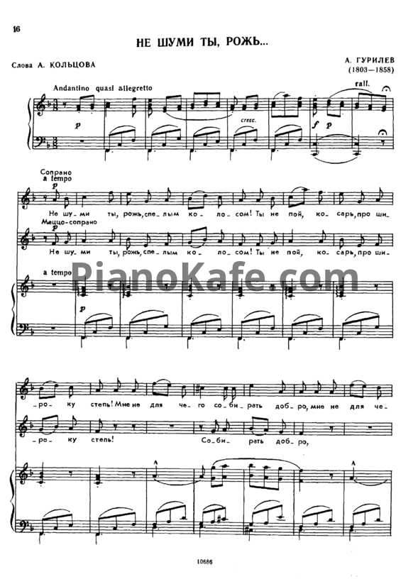 Для лирики Кольцова характерна музыкальность. Поэт добивался ее посредством стихотворного размера, аллитераций, повторов. Неудивительно, что композиторы часто обращались к творчеству Алексея Васильевича. Стало популярным романсом и произведение «Не шуми ты, рожь…». На музыку стихотворение Кольцова положил русский композитор девятнадцатого века Александр Гурилев.