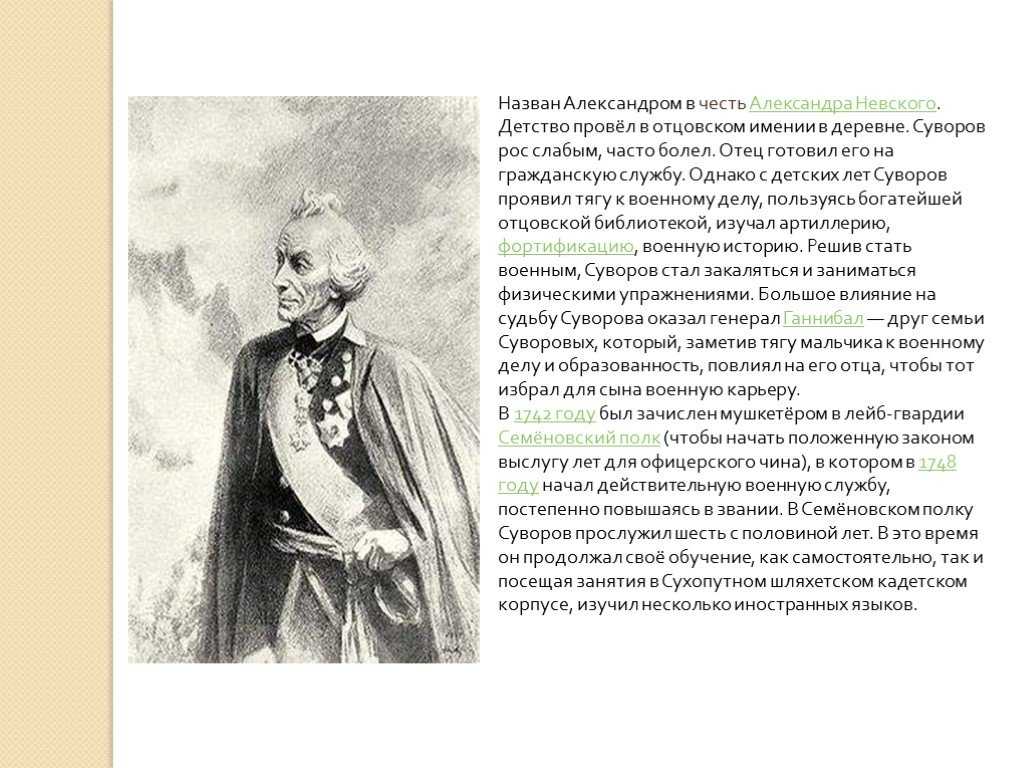 в биографии Александра Суворова происходит важное событие: его зачислили мушкетером в Семеновский полк, где он прослужил почти 7 лет. В этот период он продолжал заниматься самообразованием и усиленно учил иностранные языки. Достоверно известно об одном интересном случае, который произошел с Суворовым в эти годы биографии