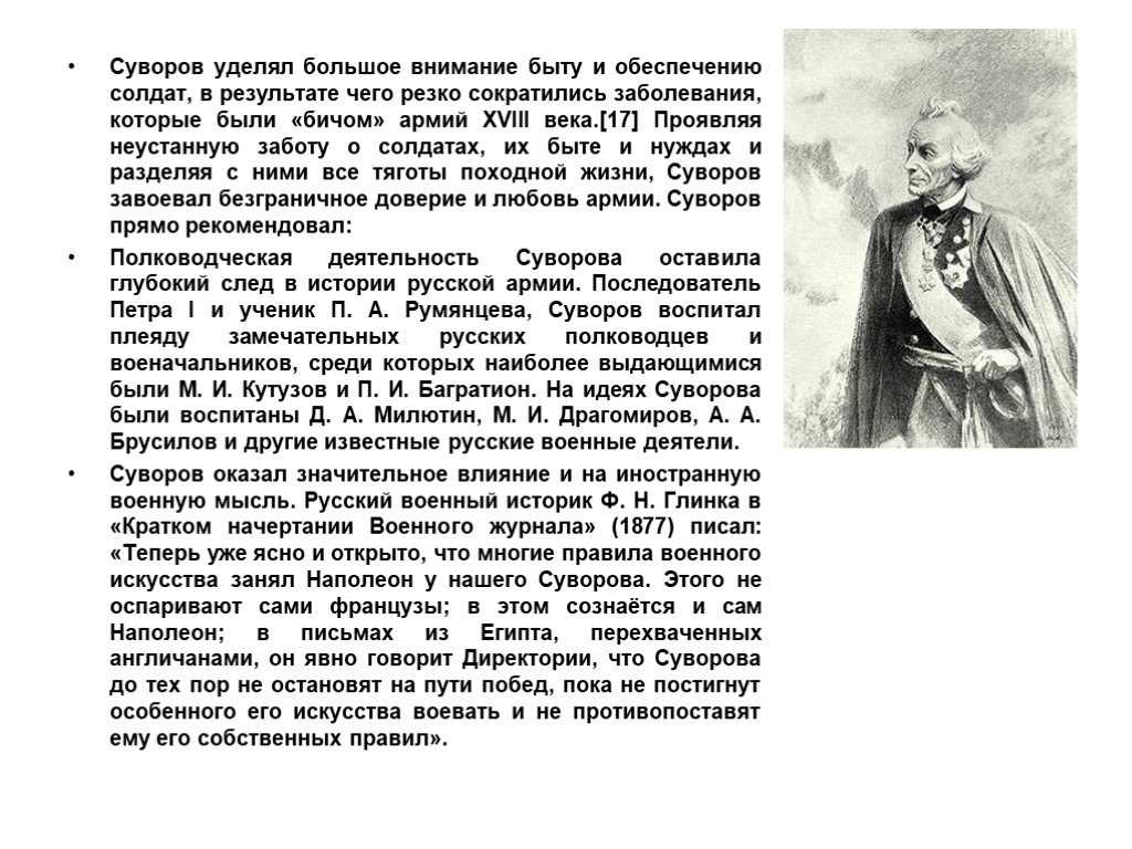 В биографии его не значится ни одного поражения. Суворов поистине гениальный полководец, герой своего времени. Александр Васильевич оставил большой след не только в российской истории, но и мировой.