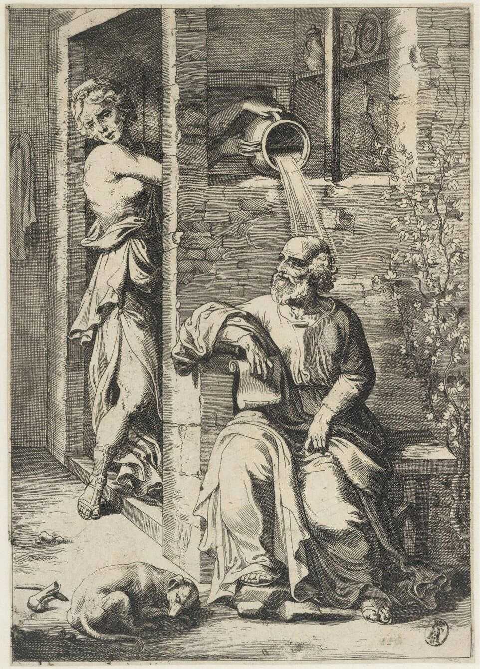 Изображение Ксантиппы, выливающей горшок с помоями на Сократа
