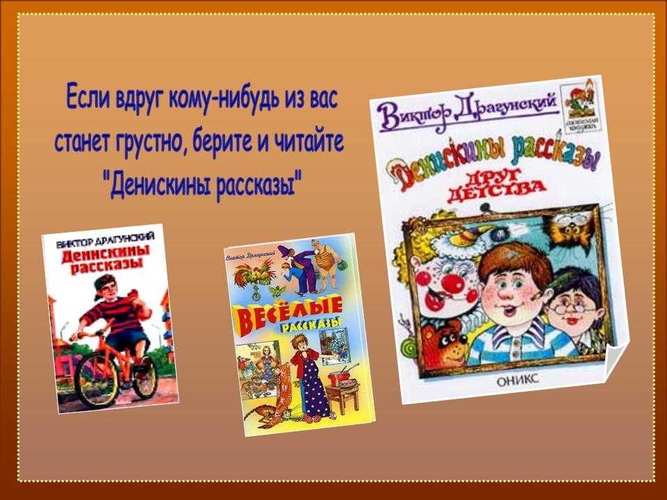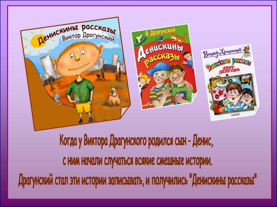 Книга «Денискины рассказы» остаётся популярной до сих пор. Её с удовольствием читают дети младшего школьного возраста. Имя главному герою дано неслучайно — так зовут сына Виктора. В книге несколько десятков рассказов. Уже по названиям можно понять, что они полны искромётного юмора, однако в каждом произведении присутствуют нотки грусти. Вот лишь несколько рассказов, которые детям хочется перечитывать снова и снова: