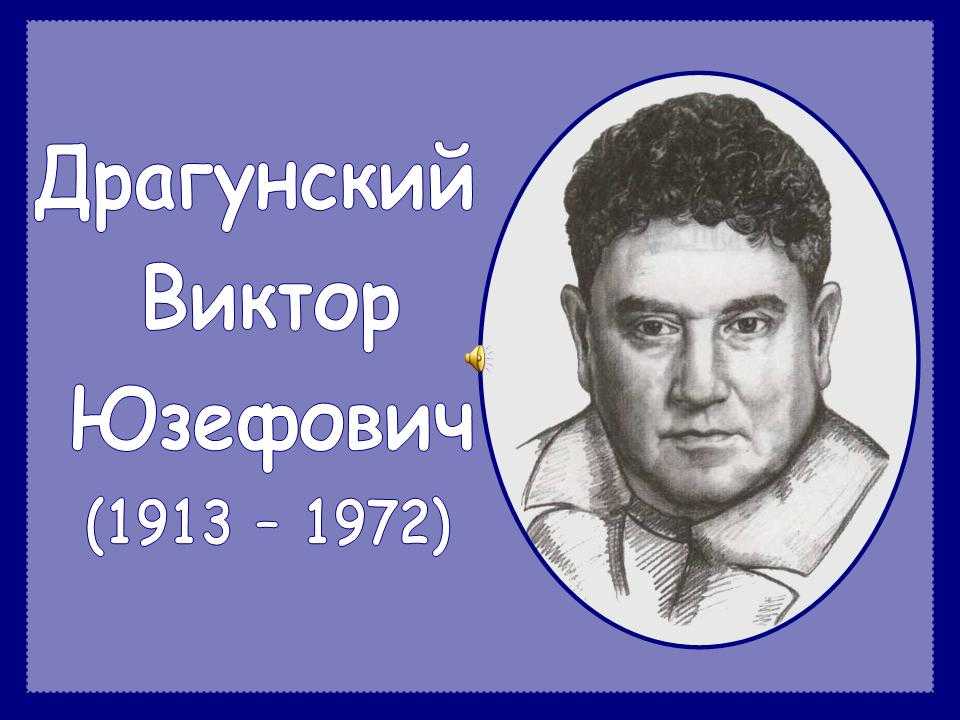 (30.11.1913 – 06.05.1972) появился на свет в Нью-Йорке. Его родители, белорусские евреи, отправившиеся незадолго до рождения будущего классика детской литературы искать лучшей доли за океан, вскоре были вынуждены вернуться домой. Виктор Драгунский рано лишился отца – он умер от тифа во время Первой мировой войны. Мать еще дважды выходила замуж: первый раз – за красного комиссара Войцеховского, второй – за актёра еврейского театра Михаила Рубина. Благодаря своему второму отчиму Виктор Драгунский рано познал все тяготы гастрольной жизни. Будучи активным участником представлений, ему пришлось освоить искусство декламации, научиться бить чечётку, вести конферанс. Все эти «премудрости» давались мальчишке без особого труда благодаря врожденному артистизму, великолепной памяти, тонкому чувству юмора. С 1925 года семья стала постоянно жить в Москве. После того как Рубин однажды не вернулся домой с очередных гастролей, Виктор Драгунский был вынужден добывать хлеб самостоятельно. За несколько лет он сменил множество профессий (ему даже довелось поработать лодочником, катая влюблённые пары по Москве-реке у Нескучного сада), но ни одна из них не стала для него делом жизни. Семнадцатилетним парнишкой Виктор Драгунский случайно увидел объявление о том, что Литературно-театральные мастерские Алексея Дикого проводят набор желающих учиться актёрскому мастерству. Окончив их в 1935 году, некоторое время выступал на сцене Театра транспорта. После смотра молодых талантов, где Виктор Драгунский очень удачно выступил, ему предложило работу руководство Театра сатиры. К этому же времени относятся первые литературные опыты молодого актёра – фельетоны, юморески, цирковые репризы. Во время Великой Отечественной войны,