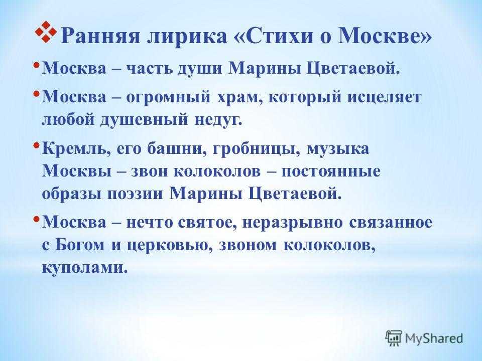 Ранняя лирика «Стихи о Москве» Москва – часть души Марины Цветаевой. Москва – огромный храм, который исцеляет любой душевный недуг. Кремль, его башни, гробницы, музыка Москвы – звон колоколов – постоянные образы поэзии Марины Цветаевой. Москва – нечто святое, неразрывно связанное с Богом и церковью, звоном колоколов, куполами.