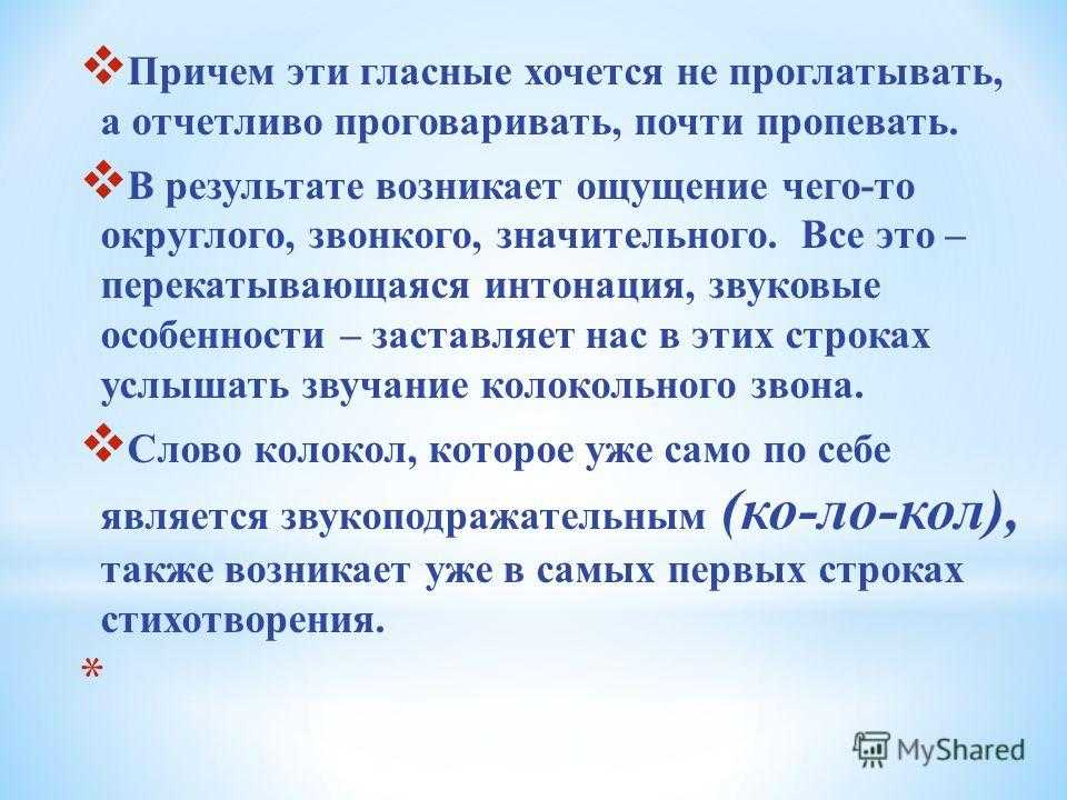 Причем эти гласные хочется не проглатывать, а отчетливо проговаривать, почти пропевать. В результате возникает ощущение чего-то округлого, звонкого, значительного. Все это – перекатывающаяся интонация, звуковые особенности – заставляет нас в этих строках услышать звучание колокольного звона. Слово колокол, которое уже само по себе является звукоподражательным (ко-ло-кол), также возникает уже в самых первых строках стихотворения. *