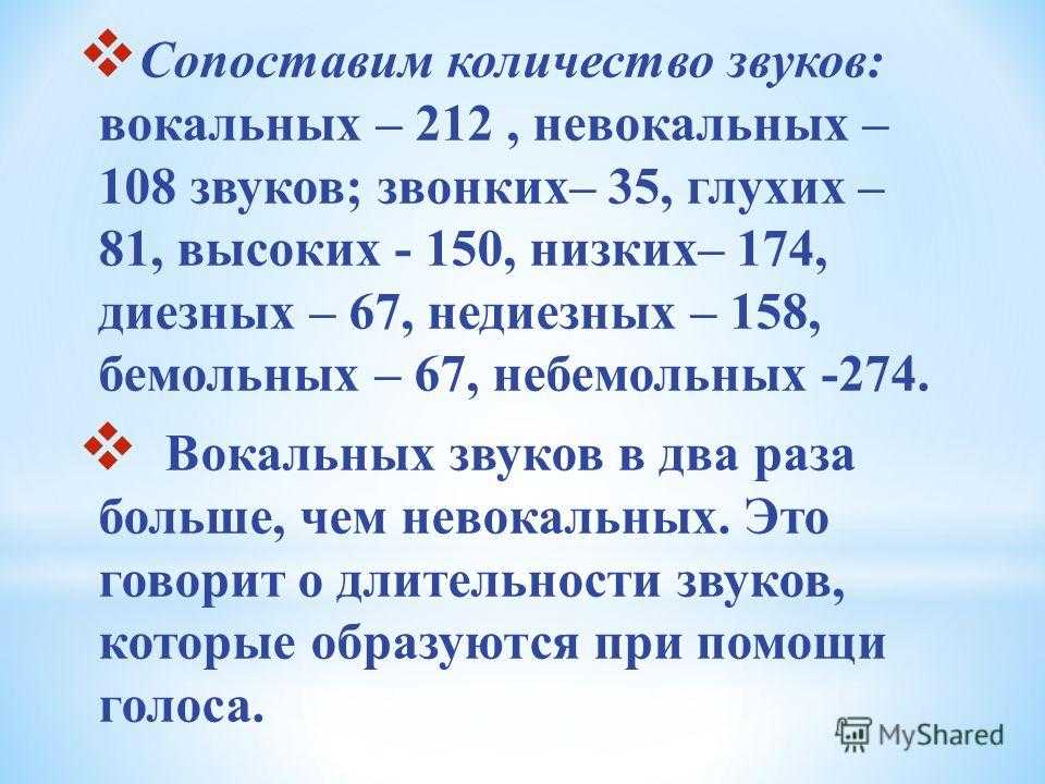 Сопоставим количество звуков: вокальных – 212, невокальных – 108 звуков; звонких– 35, глухих – 81, высоких — 150, низких– 174, диезных – 67, недиезных – 158, бемольных – 67, небемольных Вокальных звуков в два раза больше, чем невокальных. Это говорит о длительности звуков, которые образуются при помощи голоса.