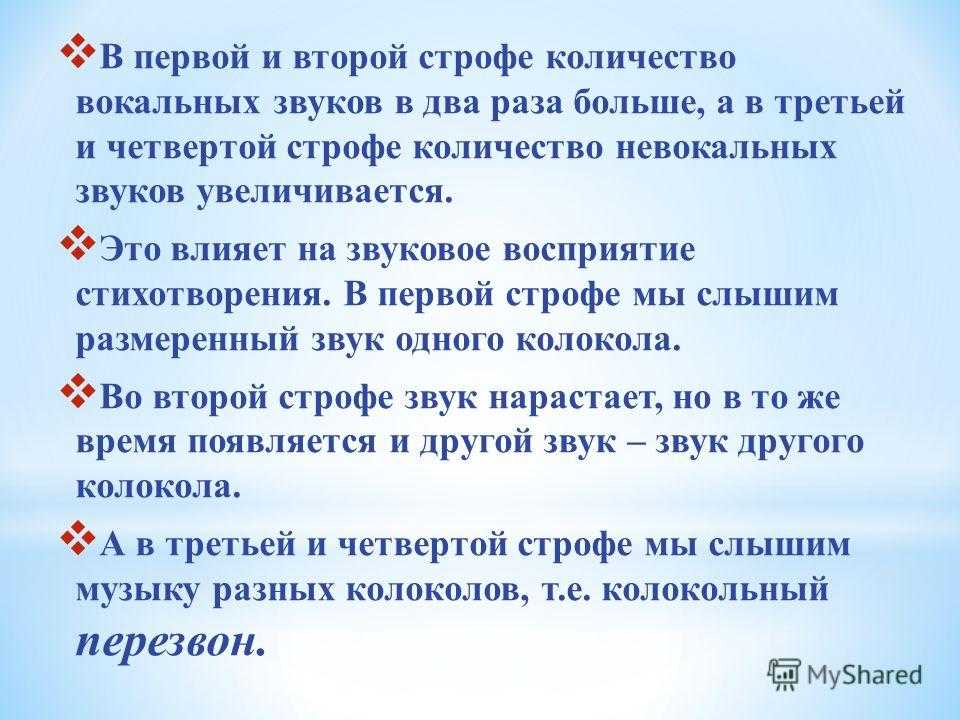 В первой и второй строфе количество вокальных звуков в два раза больше, а в третьей и четвертой строфе количество невокальных звуков увеличивается. Это влияет на звуковое восприятие стихотворения. В первой строфе мы слышим размеренный звук одного колокола. Во второй строфе звук нарастает, но в то же время появляется и другой звук – звук другого колокола. А в третьей и четвертой строфе мы слышим музыку разных колоколов, т.е. колокольный перезвон.