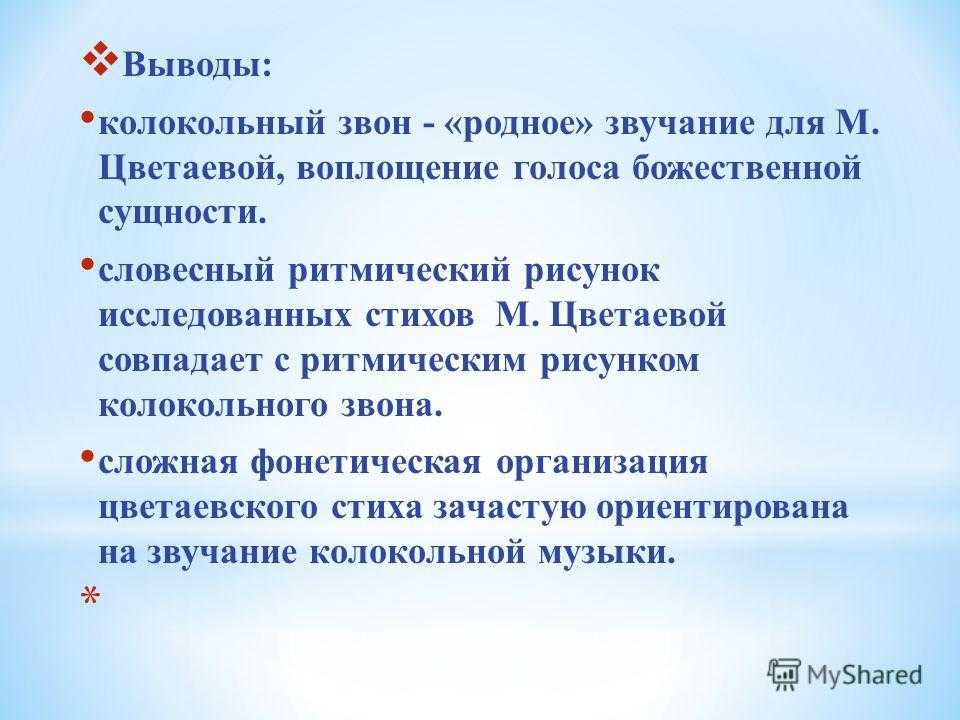 Выводы: колокольный звон — «родное» звучание для М. Цветаевой, воплощение голоса божественной сущности. словесный ритмический рисунок исследованных стихов М. Цветаевой совпадает с ритмическим рисунком колокольного звона. сложная фонетическая организация цветаевского стиха зачастую ориентирована на звучание колокольной музыки. *