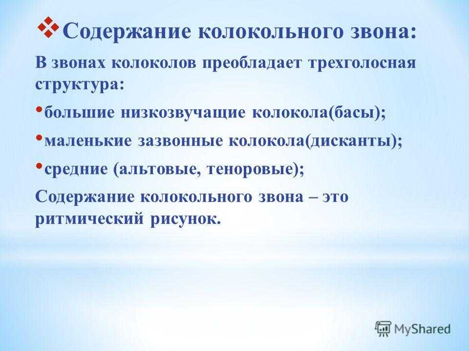 Содержание колокольного звона: В звонах колоколов преобладает трехголосная структура: большие низкозвучащие колокола(басы); маленькие зазвонные колокола(дисканты); средние (альтовые, теноровые); Содержание колокольного звона – это ритмический рисунок.