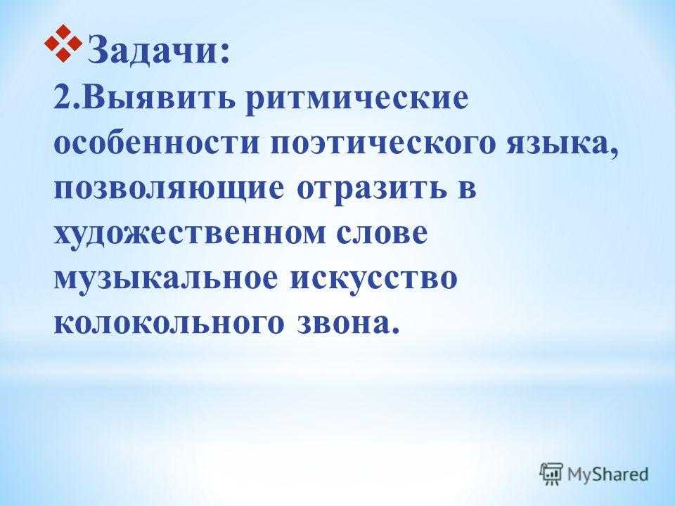 Задачи: 2.Выявить ритмические особенности поэтического языка, позволяющие отразить в художественном слове музыкальное искусство колокольного звона.