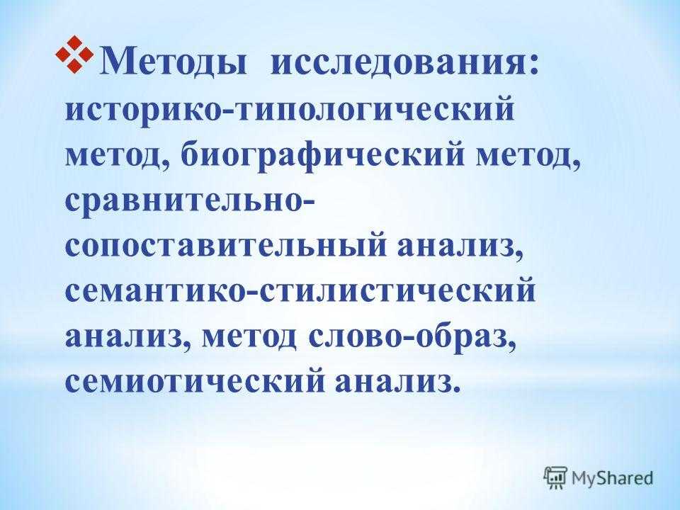 Методы исследования: историко-типологический метод, биографический метод, сравнительно- сопоставительный анализ, семантико-стилистический анализ, метод слово-образ, семиотический анализ.