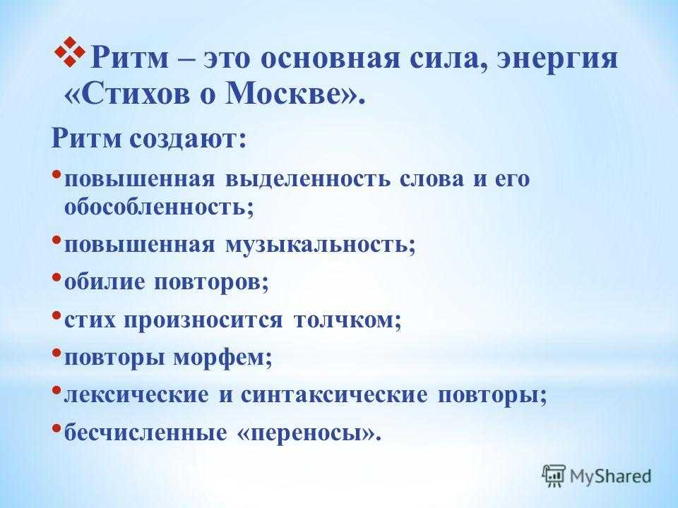 Ритм – это основная сила, энергия «Стихов о Москве». Ритм создают: повышенная выделенность слова и его обособленность; повышенная музыкальность; обилие повторов; стих произносится толчком; повторы морфем; лексические и синтаксические повторы; бесчисленные «переносы».