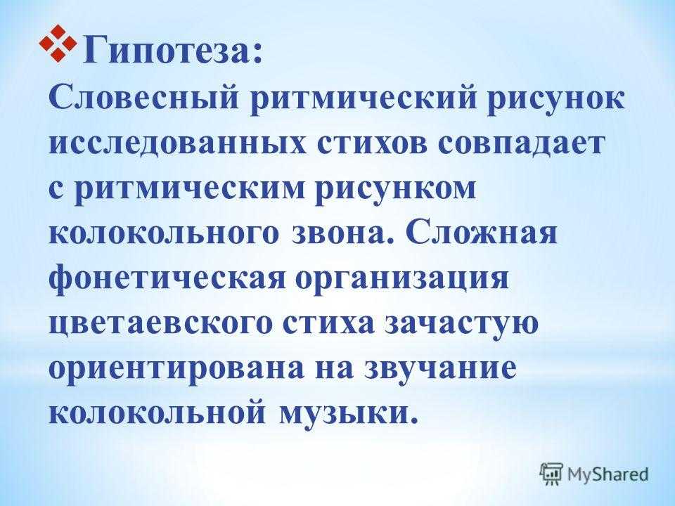 Гипотеза: Словесный ритмический рисунок исследованных стихов совпадает с ритмическим рисунком колокольного звона. Сложная фонетическая организация цветаевского стиха зачастую ориентирована на звучание колокольной музыки.