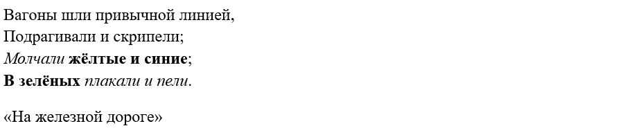 Обратим внимание, что этот отрывок осложнён метафорами. Жёлтые, синие и зелёные – это вагоны различных классов