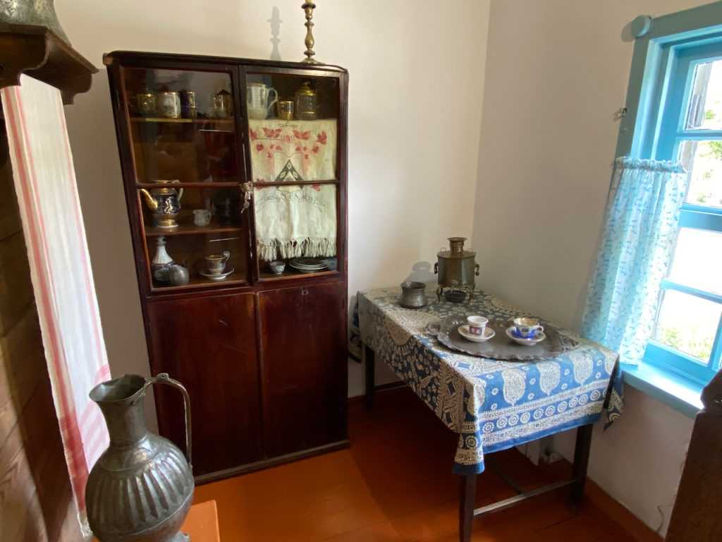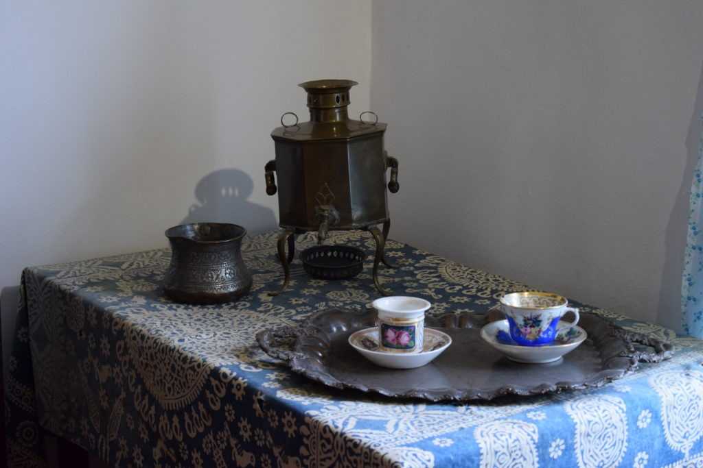 Из обстановки и вещей того времени, когда здесь жил Лермонтов, сегодня мало, что осталось. Но все же кое-что сохранилось. В буфетной на старинном столе под скатертью — дорожный самовар и чашки на подносе родом из 19 века. Рядом шкаф с посудой и домотканым полотенцем с гербом лермонтовского рода. На нем вышит девиз рода в переводе с латинского: «Судьба моя Иисус».