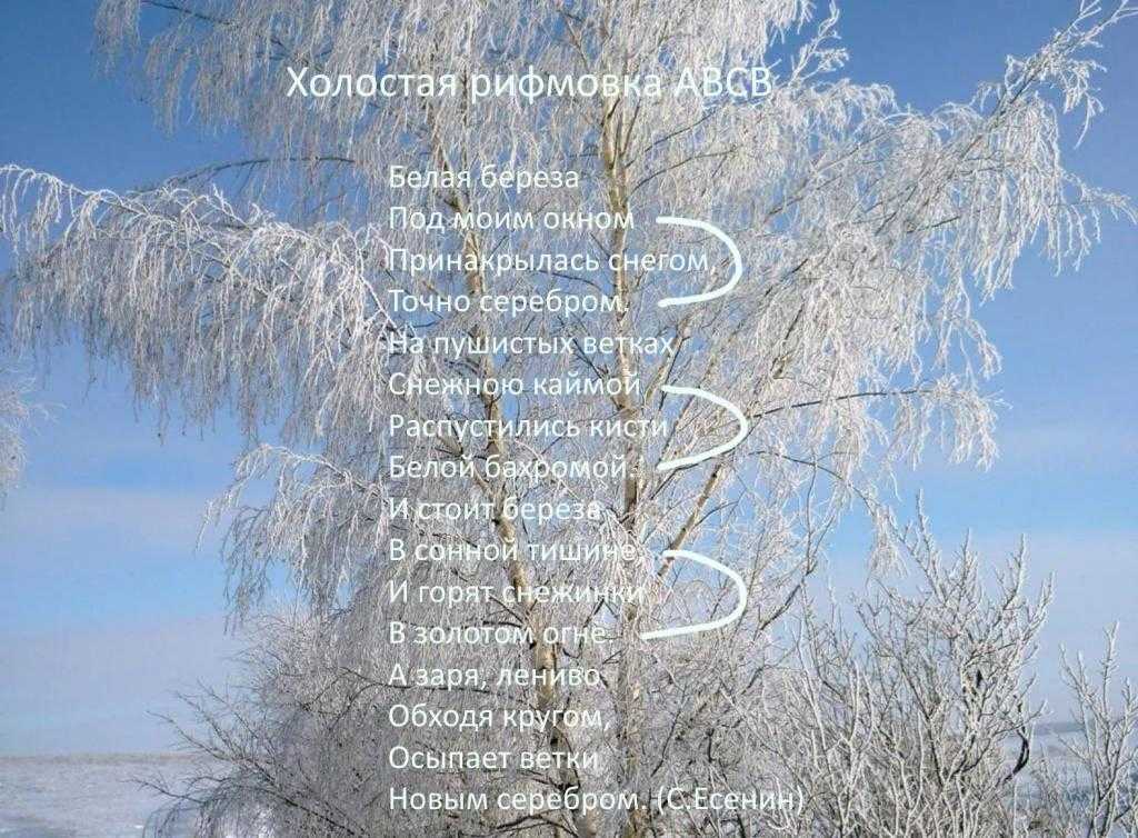 С. Есенин очень тонко чувствовал поэзию и мог, даже используя нерифмованные первую и третью строки, создавать прекрасные произведения. Одним из примеров служит стихотворение «Белая береза», которое стало песней. Секрет чарующего влияния есенинской лирики в красивых словах на концах нерифмованных строк: береза, снегом, ветках, кисти, снежинки, лениво, ветки. Простое перечисление уже создает неспешное зимнее настроение.